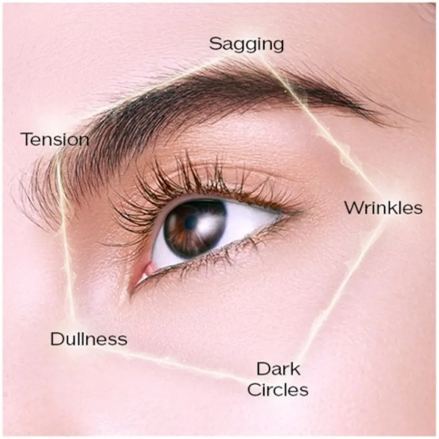 2. Die Augenpflege mit einem Finger auf die Augenpartie (Augenlider, zwischen den Augenbrauen, Schläfen und unter den Augen) auftragen und dreimal um die Augen herumstreichen.
