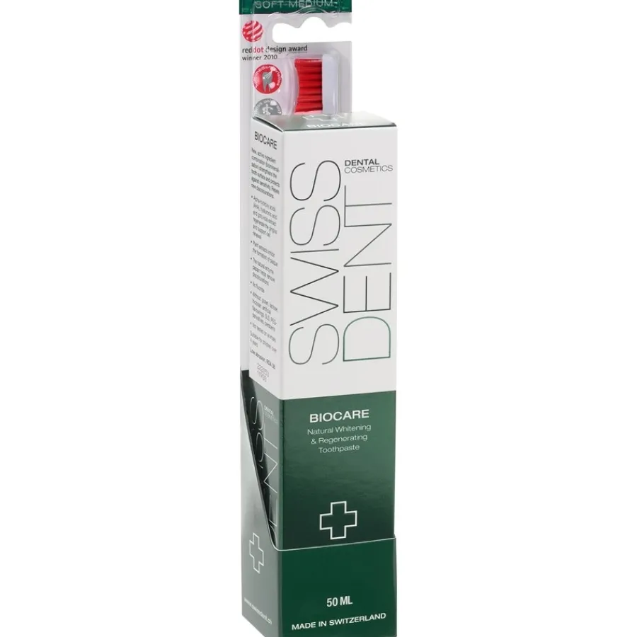 Die in den Biocare Combo Pack Sets enthaltene BIOCARE Zahnpasta von Swissdent enthält eine Wirkstoffkombination zur Biomineralisation der Zahnoberfläche. Haben die Wirkstoffe sich eingelagert, stärken sie den Zahnschmelz und machen die Zahnoberflächen weniger empfindlich. Auch wird neuen Verfärbungen vorgebeugt. Alpha-Hydroxy-Säure hilft dem Zahnfleisch, sich zu regenerieren, während Pflanzenextrakte die Gesundheit des Zahnfleisches unterstützen und die Bildung von Plaque hemmen.Zu den Biocare Combo Pack Sets gehört außerdem eine PROFI COLOURS Zahnbürste von Swissdent. Diese erleichtert mit ihrem kleinen Bürstenkopf die Zahnpflege und macht es Ihnen möglich, auch schwierige Stellen im Mundraum gut zu erreichen. Dabei passt sich das patentierte löffelförmige Borstenfeld perfekt an die Zahnoberflächen an und schont das Zahnfleisch. Der wie ein zahnmedizinisches Instrument ausgeformte Zahnbürstengriff erleichtert Ihnen die Handhabung.