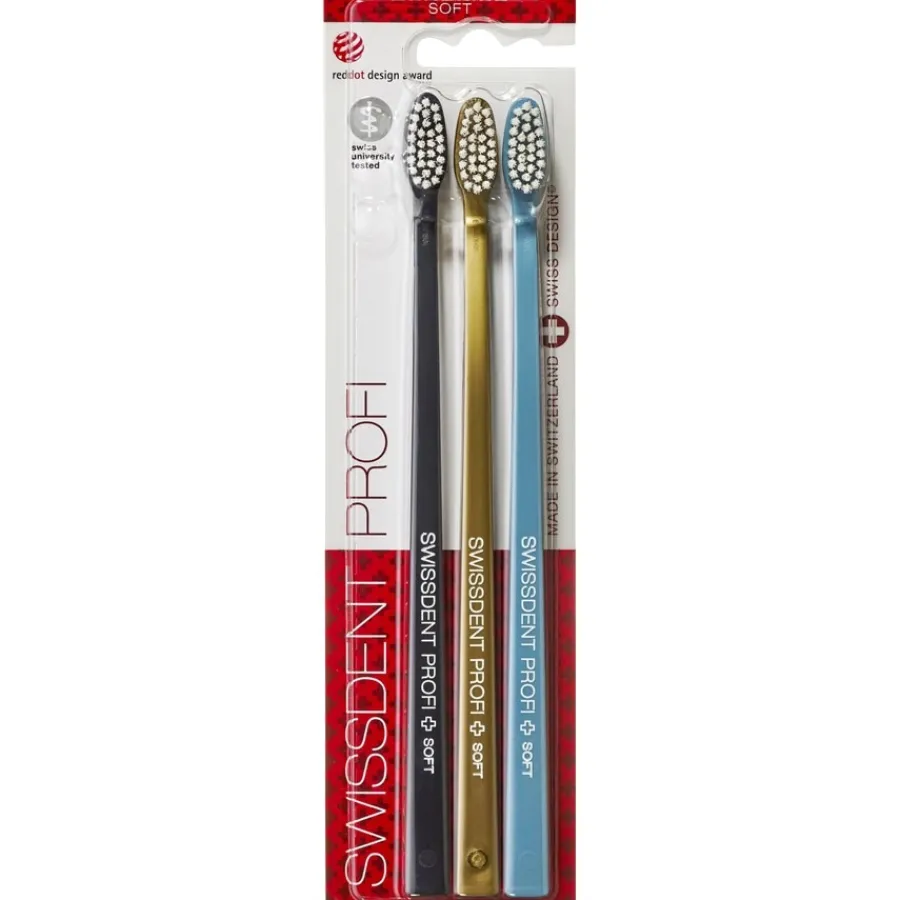 Der kleine Bürstenkopf der patentierten Swissdent Profi Whitening Trio Soft Zahnbürsten ist mit einem löffelförmigen Borstenfeld ausgestattet, das sich an die Zahnkonturen anpassen kann, ohne das Zahnfleisch zu irritieren. Der Griff ist geformt wie ein Instrument aus der Zahnmedizin und erleichtert die Handhabung. So kommen Sie selbst an schwierige Stellen leicht heran und können auch im vorderen Zahnbereich die Zahnbürste gut führen.Die Profi Whitening Trio Soft Zahnbürsten von Swissdent erleichtern die Zahnpflege und machen besonders präzises Putzen möglich. Der wie ein Zahninstrument geformte Griff liegt gut in der Hand. Weiche Nylonborsten mit Whitening-Mikropartikeln helfen, den Whitening-Effekt Ihrer Zahnpasta zu verbessern. Gleichzeitig sind sie sanft und tragen dazu bei, dass sich irritiertes Zahnfleisch beruhigen kann. Das beugt einem Zahnfleischschwund vor.