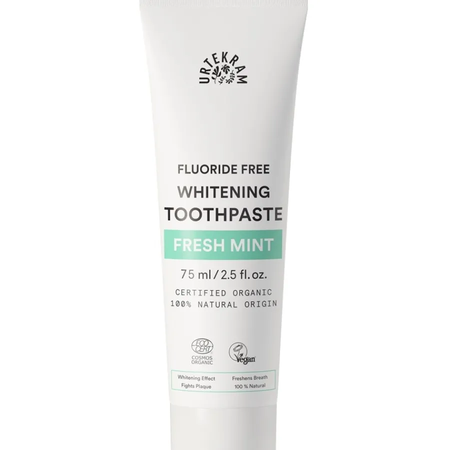 Die Fluoride Free Whitening Toothpaste Fresh Mint aus dem Dental Care Sortiment von Urtekram wirkt mit dem patentierten Bio9-Komplex und hellt die Zähne schonend auf. Die Zahncreme ist frei von Fluor hergestellt. Stattdessen kommt das Mineral Apatit zum Einsatz, das ein natürlicher Bestandteil von Zahnschmelz ist. Mit dieser zu 100 % natürlichen Rezeptur wird der Zahnschmelz effektiv gestärkt, Plaque sowie Zahnstein reduziert und die Zähne vor Karies geschützt. Mit der dreifachen Kraft der Minze sorgt dieses Dental Care Produkt für frischen Atem. Die ätherischen Öle aus Pfefferminze, grüner Minze sowie Ackerminze bestechen mit ihrer antibakteriellen und entzündungshemmenden Wirkung. Das Zahnfleisch wird durchblutet und die Mundflora regeneriert. Die Fluoride Free Whitening Toothpaste Fresh Mint mit Weiß-Effekt ist ideal für die tägliche Zahnpflege.