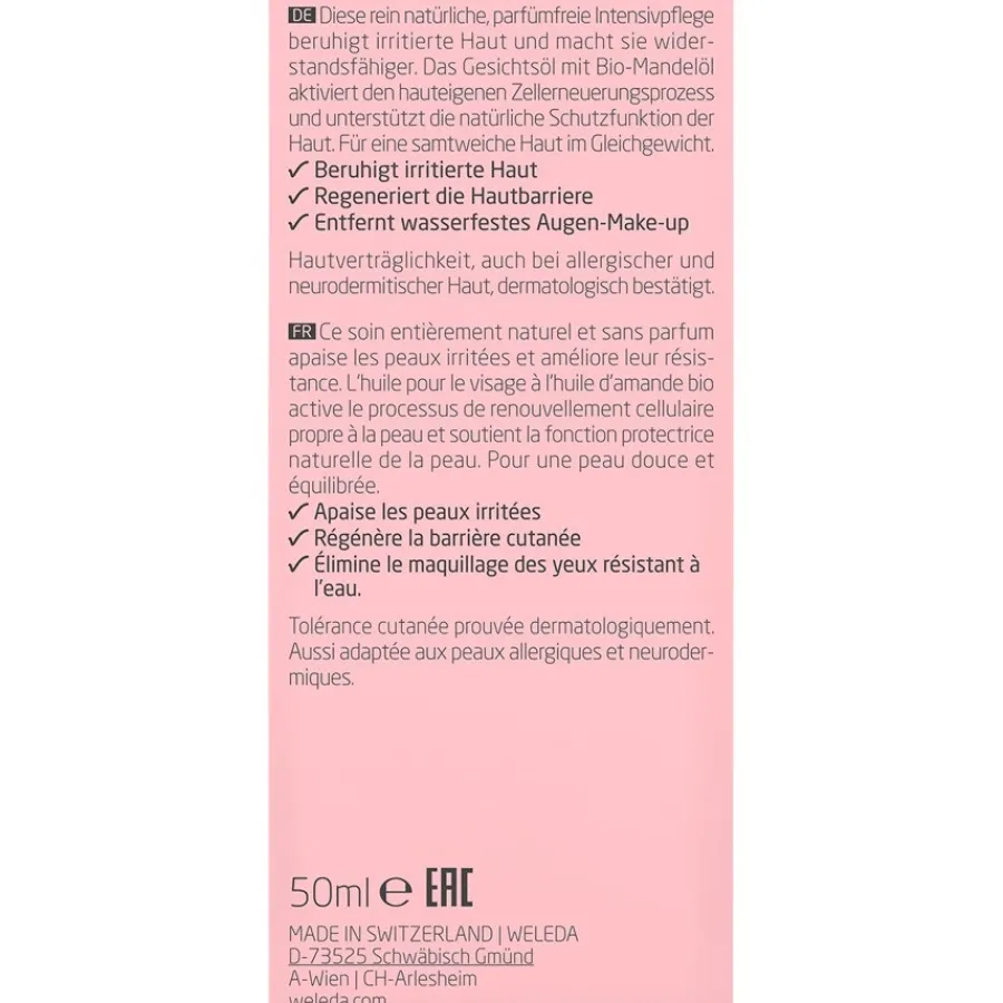 Die Gesichtspflege mit Bio-Mandelöl wurde von Weleda mit anthroposophischen Ärzten und Pharmazeuten entwickelt, um die natürliche Schutzfunktion sensibler Haut wiederherzustellen. Das Mandelöl stammt aus nachhaltigem Bio-Anbau in Alicante in Spanien und ist eine ideale Intensivpflege für irritierte, sensible oder trockene Haut. Zur täglichen Pflege oder als Schutz bei Kälte genügen bereits wenige Tropfen, die auf der Handinnenfläche verteilt und auf die noch feuchte Gesichtshaut aufgetragen werden. Die Intensivpflege kann alleine oder in Kombination mit weiteren Produkten aus der Pflegeserie, wie zum Beispiel der Mandel-Gesichtscreme oder Feuchtigkeitspflege, angewendet werden. Das Gesichtsöl ist auch zur sanften Entfernung von Augen-Make-up geeignet und wird hierzu auf ein angefeuchtetes Wattepad gegeben.