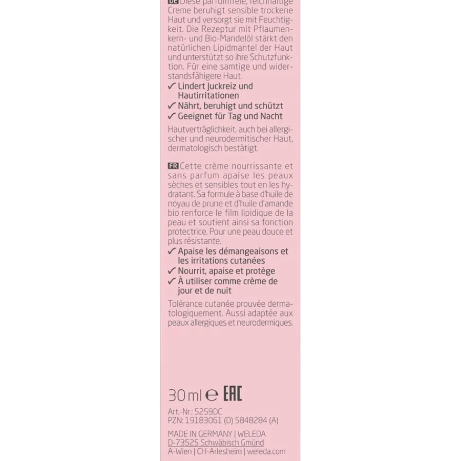 Die Mandel Gesichtscreme harmonisiert die Hautfunktion, indem sie den Lipidmantel stabilisiert. Sie enthält gut verträgliches Mandelöl, das einen besonders hohen Anteil an ungesättigten Fettsäuren aufweist. Mandelöl ist für die Pflege von empfindlicher, rauer, schuppiger und trockener Haut geeignet. Auch bei der Säuglings- und Kleinkinderpflege kommt es regelmäßig zum Einsatz. Mandel Sensitiv Gesichtscreme wird jeden Morgen auf die gereinigte Haut aufgetragen. Verteilen Sie diese Tagespflege sparsam auf Gesicht, Hals und Dekolleté. Werfen Sie auch einen Blick auf die Wohltuende Feuchtigkeitspflege von Weleda, die für empfindliche Mischhaut entwickelt wurde!