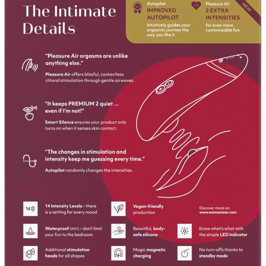 Sich einfach zurücklehnen und überraschen lassen? Mit Womanizer PREMIUM 2 wird die Me-Time sinnlich und entspannt! Der verbesserte Autopilot leitet Ihre Lust und überrascht Sie mit 14 Intensitätsstufen – je nach Stimmung. Das Key-Feature ist auch bei diesem Toy die patentierte Pleasure Air Technology, die mit sanften Luftschwingungen völlig berührungslos die Klitoris massiert. Die Folge: noch nie dagewesene Orgasmen. Für eine besonders diskrete Auszeit sorgt die Smart Silence Funktion. Bedeutet: PREMIUM 2 startet erst bei Hautkontakt. Nimmt man das Toy weg, verstummt es. Dank LED Kommunikation ist die Bedienung des Klitoris Stimulators so einfach wie nie, denn sie zeigt an, in welchem Modus man sich befindet und wi der Akkustand ist,