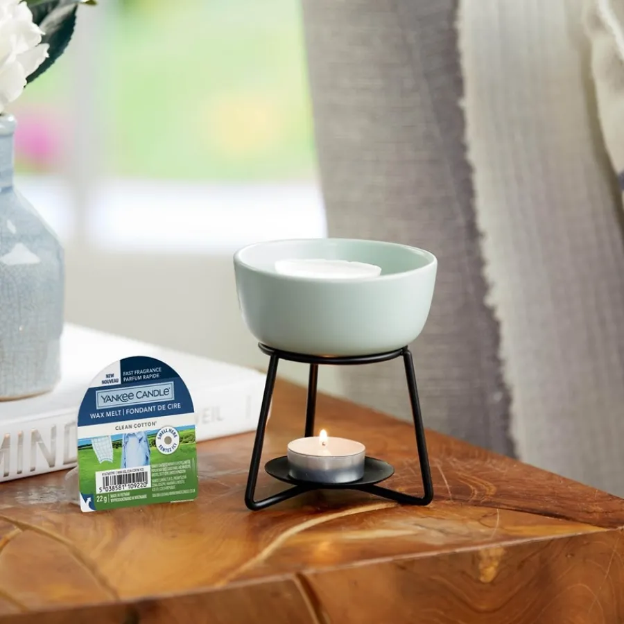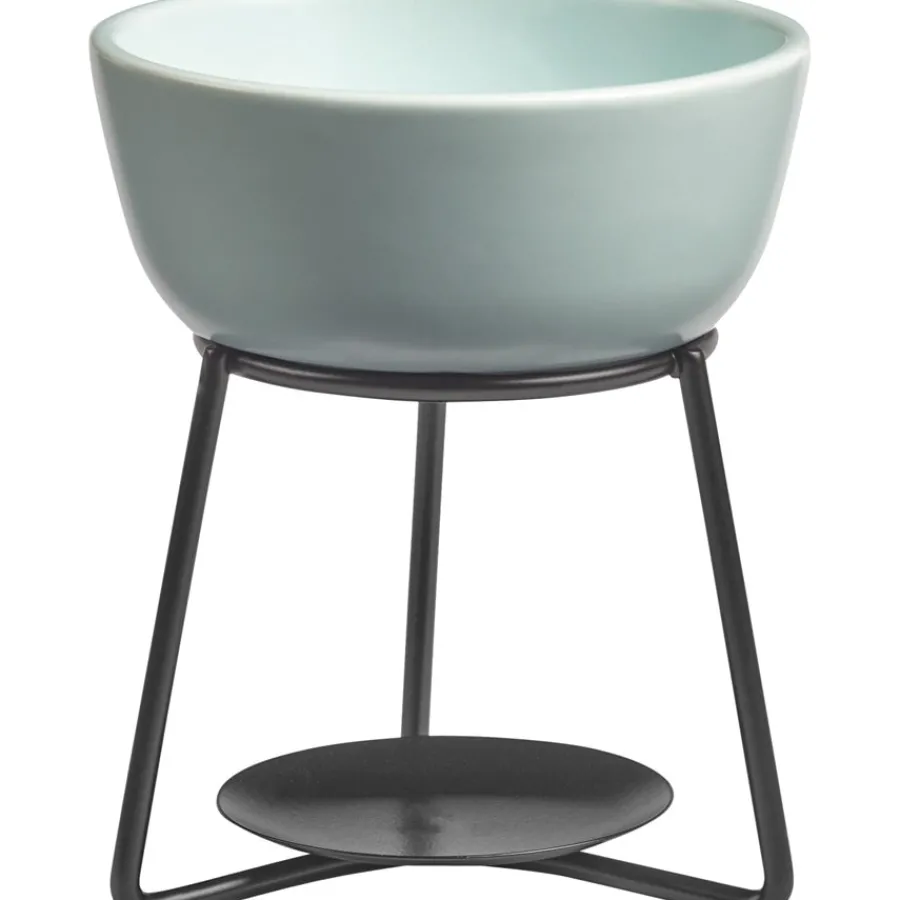 Ein fragil wirkendes und dennoch stabiles Gestell aus Metall trägt nicht nur die hellblaue Schale, in die der gewünschte Duft gefüllt wird. Es trägt auch eine kleine Plattform für ein Teelicht, das unter der Schale die Flüssigkeit langsam erwärmt und dadurch den Duft verbreitet. Die Yankee Candle Pebble Tart Scented Lamp Spa Blue ist eine elegante Duftlampe die zu den unterschiedlichsten Wohnstilen passt. Sie kann das Ambiente ganz entspannt heben und so zu einem herrlichen Wohlgefühl beitragen. Natürlich sollte die Yankee Candle Pebble Tart Scented Lamp Spa Blue nie ohne Aufsicht betrieben werden, da eine echte Kerze brennt.
