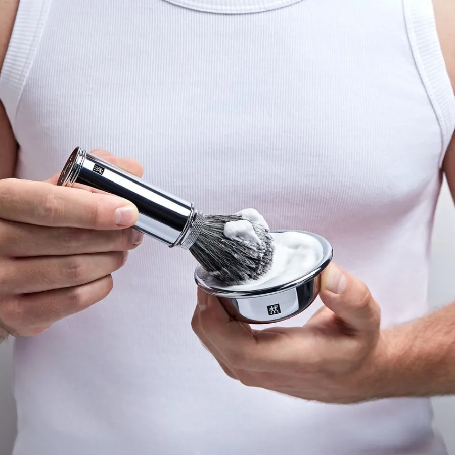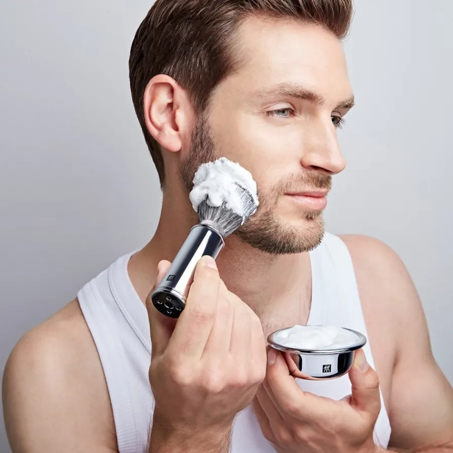 – Den Rasierschaum mit dem Rasierpinsel in kreisenden Bewegungen auftragen.